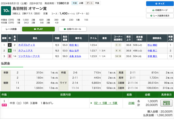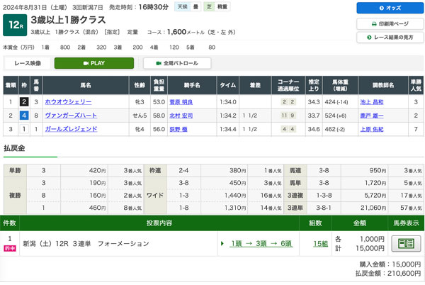 8/31(土)的中結果 2024年8月31日 novelist 現役競馬プロの競馬攻略マニュアルを駆使した本日の結果はこちらとなります。 中京10R【的中】3連単109,030円 109万300円払い戻し!! 新潟12R【的中】3連単21,060円 21万600円払い戻し!! あなたも万馬券を掴み取りたいなら 現役競馬プロの競馬攻略マニュアル