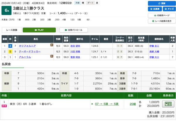 10/14(月)的中結果 2024年10月14日 novelist 現役競馬プロの競馬攻略マニュアルを駆使した本日の結果はこちらとなります。 東京6R【的中】3連単23,160円 23万1600円払い戻し!! 東京12R【的中】3連単46,830円 46万8300円払い戻し!! あなたも万馬券を掴み取りたいなら 現役競馬プロの競馬攻略マニュアル