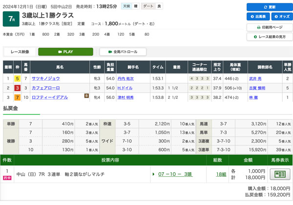 12/1(日)万馬券的中結果 2024年12月1日 novelist 中山7R【的中】3連単15,920円 15万9200円払い戻し!! 毎週のように万馬券を輩出している当ブログの会員登録詳細は下記よりご確認ください。 →会員募集中←