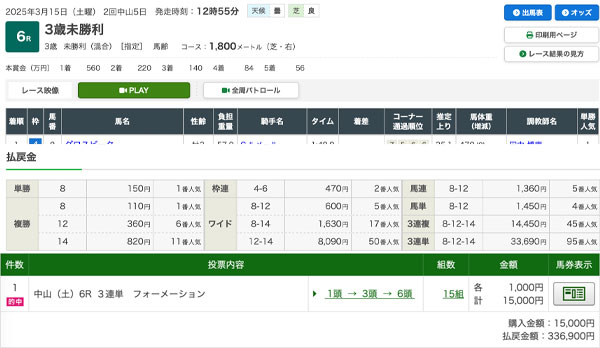 3/15(土)万馬券的中結果 2025年3月15日 novelist 中山6R【的中】3連単33,690円 33万6900円払い戻し!! 阪神10R【的中】3連単24,070円 24万700円払い戻し!! 毎週のように万馬券を輩出している当ブログの会員登録詳細は下記よりご確認ください。 →会員募集中←